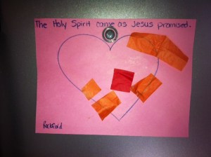 The other day I laid down my two and half-year old, Rockford (by the way the other one is Rocco and is 8 months) to change his poopy diaper. Actually, he is “potty trained” but refuses to use the toilet to poop (is it like this for your kid too?). Anyways, I laid him down to change his diaper and as he is laying there he placed both hands over his heart and said, “I have Jesus right here in my heart.”  Actually he had his hands on his neck, but I got the point. I was moved and recalled his last Sunday school lesson project I had hanging on our refrigerator. God bless our Sunday school teachers.