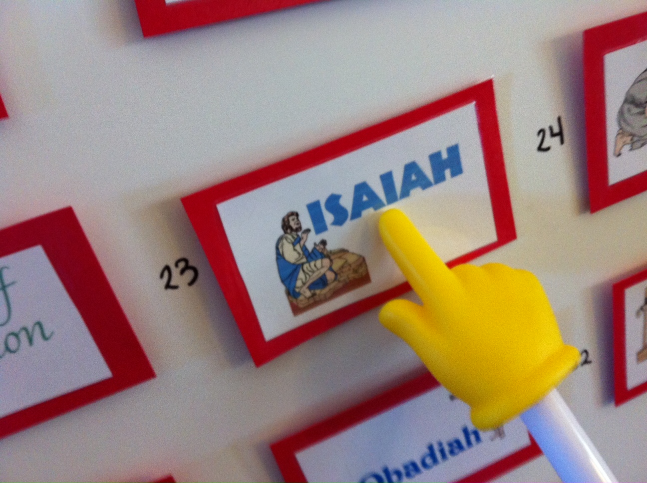 As the songs are playing I use the pointer to point to the names of the books. When my son gets more familiar or comfortable with the names and songs I will let him take the lead and start pointing to the names as he is reading or singing the names of the books. Have fun with your kids and learn the order with them…that’s what I am doing. Above all, remember why you are doing this and be encouraged that God is behind you and will see you through it.